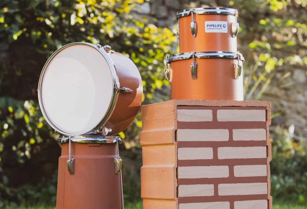 Pro vytvoření soupravy bubnů, jaké známe z hudebních sestav současných kapel, bylo zapotřebí využít jiných materiálů, především s větším průměrem a nižší váhou. V tomto směru mě velmi oslovil sortiment Wienerberger – Pipelife zaměřený na plastové trubky různého zaměření. Šachty na odpadní a dešťovou vodu jsou prvky, které jsou ve stavbách skryty pod vrstvou betonu a zeminy, jejich vlastnosti jsou ale po pevnostní stránce na nejvyšší úrovni, což je výborný základ i pro hudební nástroj. V rozmanité nabídce průměrů nebylo problém najít vhodné varianty, které lze „napasovat“ na bubenické blány standartních rozměrů. Výsledek je až nečekaně dobrý a zcela jistě snese srovnání s profesionální bicí soupravou.