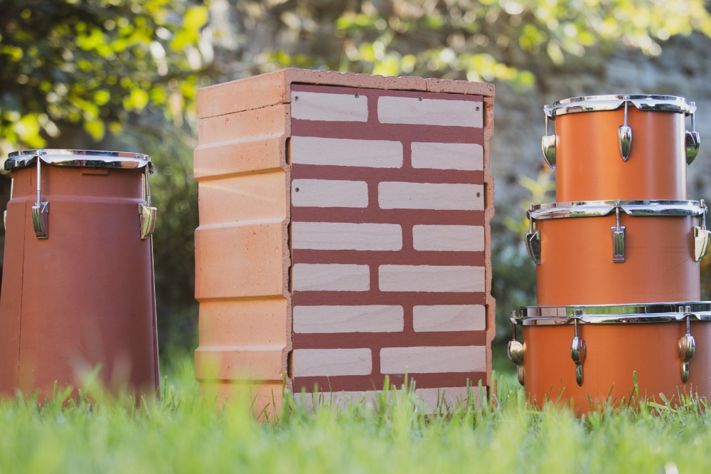 Pro hudební účely jsme doplnili ke keramofonu i několik dalších bicích nástrojů, které využíváme v rámci Keramorchestru, hudební skupiny zapsané i do České knihy rekordů. K rytmickému doprovodu jsem nejprve vytvořil univerzální nástroj ve stylu španělského cajonu. Jako základ posloužila cihla Porotherm 50 profi, doplněná rezonančními deskami a dalšími hudebními nezbytnostmi. Vyrobit klasický buben byla opravdu výzva. Nakonec mně padla do oko několik hřebenáčů. Vhodným řezem z nich lze vytvořit výseče, které po spojení tří kusů dají dohromady útvar velmi blízký komolému kuželu. Rozměr dokonce odpovídá standardizovaným rozměrům z bicích souprav.