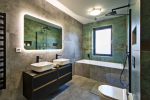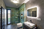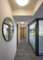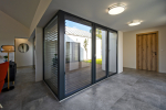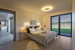 Z druhé strany je prosklené atrium, které do místnosti vpouští další cenné světlo. Z centrální chodby dále vedou další dveře do dvou dětských pokojů, pracovny, koupelny, ložnice se šatnou a koupelnou pro rodiče. K dispozici je i technická místnost a prostorná garáž. Dům má hotové podlahové vytápění, dokončené koupelny, jsou položené podlahové krytiny, vsazené obložkové zárubně a vnitřní dveře, funkční je kuchyňská sestava včetně spotřebičů, ve všech místnostech a na fasádě je kompletní LED osvětlení.