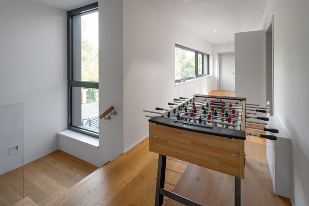 Horní patro se nese ve znamení dětského smíchu a v zápalu divokých her se leckdy otřásá celý dům. Své království zde totiž mají investorovy čtyři děti. Každé z nich disponuje stejně velkým pokojem s východem na balkon, který směřuje na zahradu a je opatřený proskleným zábradlím. „Investorův požadavek, aby každé z dětí mělo zcela totožný pokojíček, se stal klíčovým pro celý návrh domu a nejvýrazněji ovlivnil jeho současnou podobu. Zároveň se pro nás stal největší výzvou, kterou se nám ale podařilo zdolat a žádné z dětí si opravdu nemá co závidět,“ říká s úsměvem Jiří Košťál. Myslelo se i na návštěvy, a tak se zde jakožto pátý pokoj nachází i ten hostinský. Chodba ve druhém patře je dostatečně prostorná, aby zde děti mohly hrát stolní fotbal, ale průchod v ní i tak zůstal pohodlný. Dostatek světla do ní propouští dlouhé okno vedoucí po téměř celé délce stěny. Na obou koncích chodby se nachází dříve zmíněné koupelny, o které se děti dělí.
