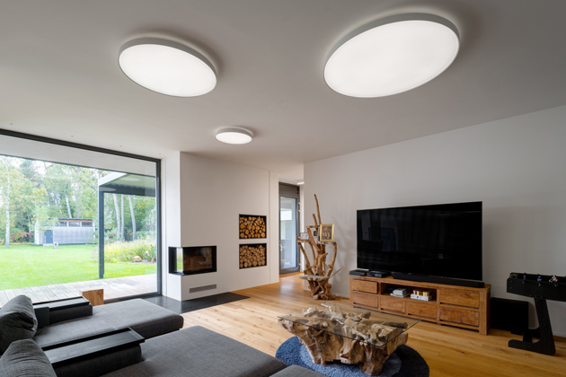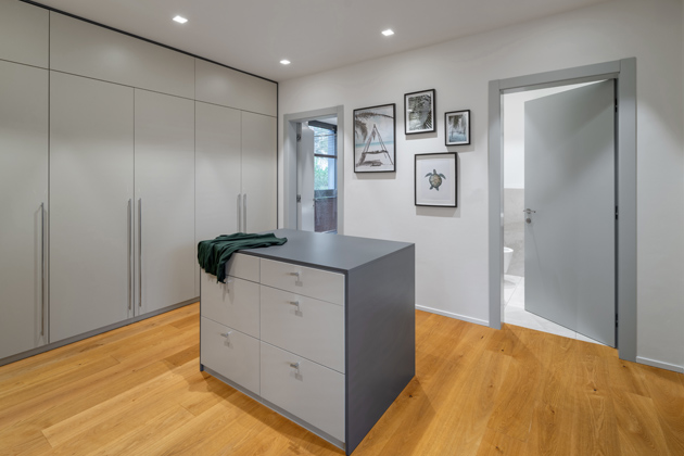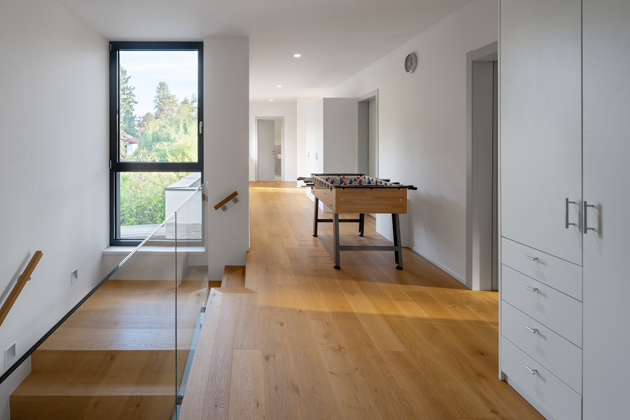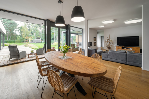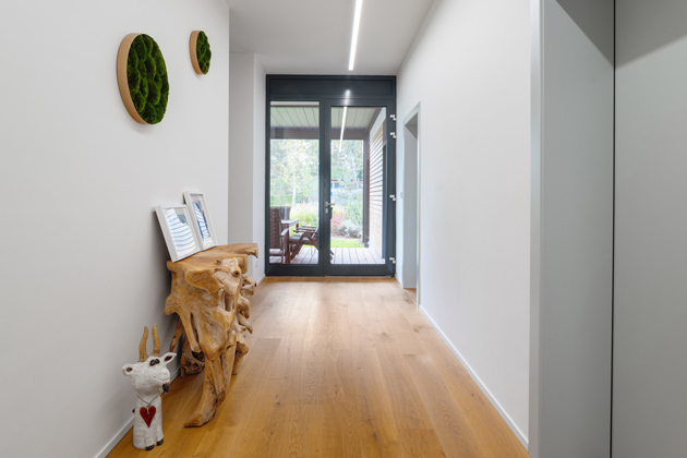 Do domu rodina vchází skrze hliníkové vchodové dveře v antracitovém odstínu s madlem o prodloužené délce 1,6 metru. Všechny vstupní a okenní prvky ve shodném materiálovém a barevném provedení v této realizaci jsou z dílny české společnosti VEKRA. Za vchodem se otevírá široká chodba, v níž upoutá samorost upravený do podoby dřevěného podstavce. Na protější straně od vchodových dveří chodbu prosvětlují velkoformátové dveře, skrze které lze vyjít na zahradu. My se ovšem vydáme dál do domu. Naše kroky celou dobu povede dřevěná podlaha velmi vysokého standardu od firmy WOHACONCEPT. Vedle dřevěných podlah v interiéru dominují sofistikovaná světelná řešení, kvalitní materiály a otevřené výhledy dopřávající přímý kontakt s přírodou.