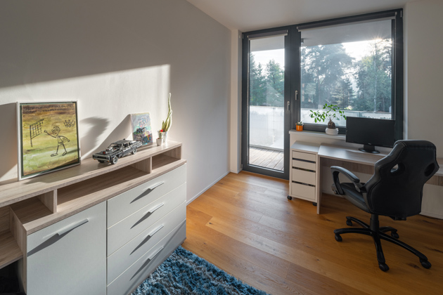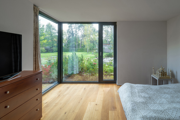 Centrální obytná místnost spojuje kuchyni s obývacím pokojem. Otevřený prostor pomyslně rozdělují dva bílé podpěrné sloupy. V první části se nachází velkorysá kuchyňská linka světle šedé barvy. Na ni navazuje úložná stěna stejného odstínu v minimalistickém provedení bez úchytek se zabudovanými spotřebiči v černé barvě. Součástí kuchyňské zóny je i dřevěný jídelní stůl, ke kterému se rodina se všemi dětmi pohodlně vejde. Prostornou šedou sedačku doplňuje konferenční stolek tvořený také dřevěným samorostem se skleněnou deskou. Podobný přírodní solitér umístěný vedle televize slouží k vystavování obrázků či fotek v rámečku. „Aby došlo k většímu propojení obytného prostoru se zahradou, zabudovali jsme přes polovinu místnosti velkoformátovou sestavu dvoukřídlých vstupních dveří a fixních oken VEKRA. Tato společná část tím získala na větší otevřenosti a rodiče mohou lépe dohlížet na děti, pokud si zrovna samy hrají venku,“ vysvětluje Jiří Košťál. Tato sestava dál přechází v klasickou zeď se zabudovaným krbem a dvěma úložnými otvory pro dřevo k zátopu. Za krbem následuje chodba vedoucí do dalších místností. Najdeme zde ložnici majitelů, kteří si dopřáli díky rohovým oknům nerušený výhled do zahrady.