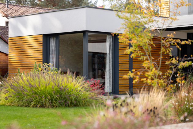 K vile náleží i rozhlehlá a udržovaná zahrada s ideálními podmínkami pro dětskou zábavu, jako jsou například dvě fotbalové brány či domeček na hraní. Ačkoliv je dům celkově velmi otevřený, většina oken je kvůli soukromí směřována právě směrem na zahradu. „To bylo jedno z našich velkých přání. Za prvé kvůli hezčímu výhledu, a za druhé jsme tím chtěli omezit zvědavé pohledy kolemjdoucích z ulice hned za domem,“ vysvětluje investor. Pobyt na zahradě zpříjemňuje venkovní terasa, která kopíruje vnitřní stranu domu a lze na ní relaxovat v pohodlných křeslech, trávit čas s rodinou u grilování či se přes ní dostat k vnitřnímu bazénu.