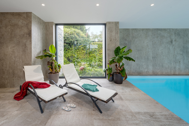 V přízemním patře se nachází i bazénová hala. V té se děti majitelů mohou celoročně bavit, díky velkoformátovému zasklení navíc opět došlo k přímému vizuálnímu propojení se zahradou. „Kolem bazénové haly bylo velmi složité navrhnout okna, jelikož jsou do rohu. Návrh navíc komplikovalo jejich členění, zasouvání, skryté prahy a další technické detaily… Vše se nám ale s dodavatelem podařilo ke spokojenosti naší i majitelů vymyslet a zrealizovat,“ říká Tomáš Durdis, a dodává: „Jako materiál rámů jsme vybrali hliník. U takto velkých sestav bychom ani jiné materiálové zpracování nevolili – hliník je zkrátka nejodolnější.“ Velkoformátový okenní systém od společnosti VEKRA zajišťuje vnitřní hale s bazénem světlost, otevřenost a zároveň optické zvětšení prostoru a propojení s okolím. „Hliník navíc výborně odolává působení vody, takže je ideální i do prostor s vyšší vzdušnou vlhkostí, jako jsou právě vnitřní bazény. Zde použitý HS portál ve variantě SLIM navíc zajišťuje ještě větší míru světlosti – jeho zúžený rám totiž poskytuje větší plochu zasklení. Za tímto účelem má tento portál v pevné části sníženou pohledovou šířku profilu. Maximální propojení s okolím podtrhuje subtilní nulový práh, jehož pojezdová lišta přesahuje pouze o pět milimetrů,“ vysvětluje Ing. Milena Tomčíková, ředitelka vývoje a produktů společnosti VEKRA, největšího českého dodavatele oken a stínění na klíč.