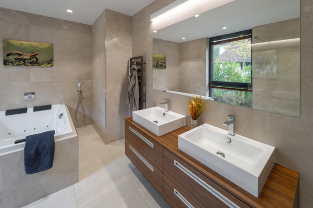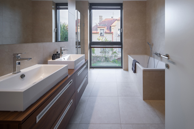 Co se týče koupelen, jsou v domě celkem tři. První se nachází v blízkosti hlavní ložnice a je vybavena jak velkou prostornou vanou, tak i sprchovým koutem. Zbývající dvě koupelny architekti situovali do horního patra. Majitel domu si takový počet pochvaluje: „Naším dalším přáním bylo mít hodně koupelen a celkově dostatečné sociální vybavení. Přeci jen jsme početná rodina a takto je to praktické.“ Koupelny jsou laděny velmi decentně a elegantně díky kombinaci světlých béžových tónů keramického obložení spolu s dřevěnými úložnými skříněmi a bílým sanitárním vybavením od společnosti ProCeram.