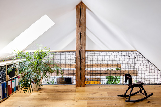 Jediným, čeho dnes tak trochu lituje, je, že do střechy osadil jen jedno celodřevěné střešní okno (VELUX) a nevpustil do interiéru více denního světla. Ze společné obývací části, která je otevřena do stropu, totiž vede jednoramenné schodiště na galerii, která slouží k odpočinku. Je tu šatna a také prostor pro hrátky dětí, aniž by byl vidět nepořádek z hraček. A v plánu je i pracovna. „Ale je tu jen jedno okno na východ, takže kdybychom udělali alespoň ještě jedno na západ, bylo by to lepší. Není tady tolik světla, kolik bych si přál...“