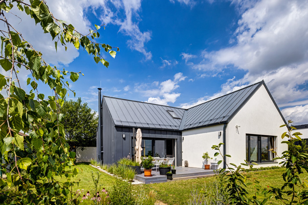 Na třech materiálech postavila mladá rodina design i funkčnost svého domu na Karlštejnsku – cihlovou stavbu pokryl plech od střechy až k patě domu a vnitřní pohodovou atmosféru navozuje především dřevo. Projekt „domu s ušima“, jak mu říká sám majitel, zaujal v soutěži HELUZ Dům roku 2021, což bylo pro investory zadostučiněním po peripetiích či spíše patáliích se stavební firmou.