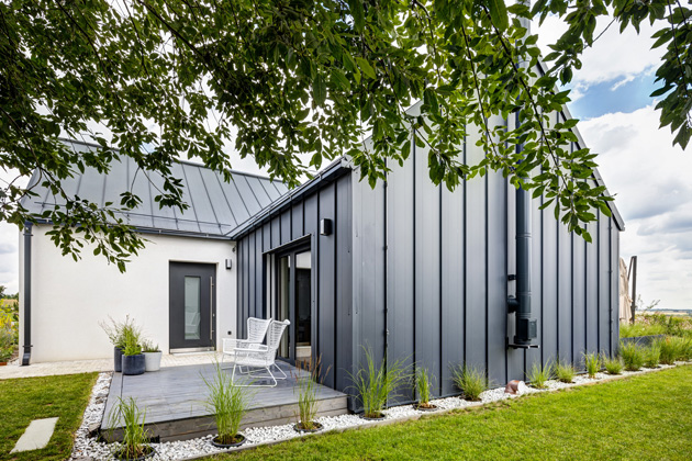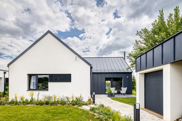 V jejich představách o domě je inspirovaly horské chalupy s plechovou střechou, líbil se jim jejich kompaktní tvar. „Dům dělá fasáda, to je to první, nač se člověk podívá. Proto jsem nechtěl jen sterilní bílou omítku, ale přál jsem si fasádu ozvláštnit,“ začíná své vyprávění „zvenčí“ investor a pokračuje: „A možnost prodloužit oplechování ze střechy na fasádu mi přišla jako nejlepší estetické i finanční řešení. Zároveň jsem tím rozdělil dům na dvě hmoty, obývací část jsme oplechovali včetně štítu, a druhou odpočinkovou část, která vytváří „T“, říkám tomu „uši“, mají bílou fasádu.“