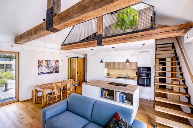 Interiér, který byl hodně dílem manželky, zase pojali ve střídmém skandinávském stylu, když dřevo zkombinovali s industriálními prvky, jako je ocel natřená kovářskou černí. S dřevem začali na podlaze, a to třívrstvou dubovou krytinou z kolekce Piacente švédského výrobce Kährs. A podobně, jako plech zvenčí, protáhli dřevo až do střechy. „Stačí odjet na dva tři dny a po návratu první, co vás udeří do nosu, je vůně dřeva, což je super. A taky se po dřevěné podlaze příjemně chodí na boso,“ chválí si investor. Dubový dekor má obložení kuchyňské linky, dveře, ale i schody do galerie v patře a pověstnou třešničkou je přiznané trámoví, které obývací prostor otevřelo až do krovu. „Dřeva není nikdy dost,“ podotýká investor a vypráví o trámech, které mají svou vlastní více než stoletou historii – pocházejí od Jičína, kde rozebírali to, co zbylo po Valdštejnské konírně a pivovaru z roku 1898. „130 let staré a zdravé dřevo je rarita,“ zdůrazňuje investor.