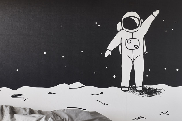 Z obývacího pokoje se po schodech vystoupá do patra, kde je ložnice s výhledem do zahrady, koupelna, zůstal tam jeden dětský pokoj a z druhého vznikla pracovna s rozkládací sedačkou pro přespání návštěv. Pokoji mladšího sourozence nyní dominuje tapeta s kosmonautem. „Koncept rekonstrukce domu je založen na tom, že jedna stěna sousedící s vedlejším domě je vždy nějak pojatá, buď jsou to přiznané cihly, které se mi ale nechtělo v dětském pokoji opakovat, tak jsem navrhla tapetu. Nabídla jsem několik grafik, jedna z nich např. vypadala jako stránka ze sešitu z matematiky s přeškrtanými příklady, ta kupodivu nevyhrála J, zvítězil motiv s kosmonautem.“