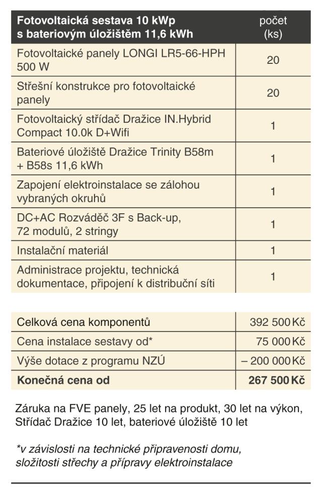 Zuzana (54 let) a Jan (57 let) žijí v malém domku na předměstí a vzhledem k tomu, že dům vytápějí plynovým kotlem, který rovněž ohřívá vodu, rádi by snížili náklady na plyn. Nedávno si pořídili menší auto na elektrický pohon a případný přebytek elektřiny by chtěli využít pro napájení nabíječky elektromobilu.