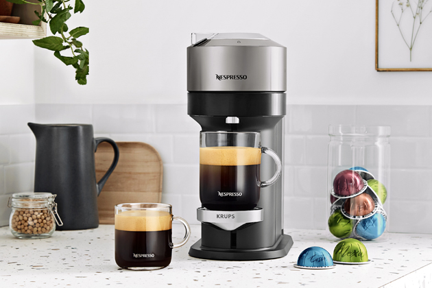 Kapslový kávovar Vertuo Next (Krups), automaticky rozpozná typ vložené kapsle, cena 3 190 Kč, www.nespresso.com