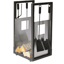 Koš na dřevo s krbovým nářadím (Lienbacher), pohrabáč, kleště, lopatka a smetáček, nerezová ocel, cena 2 155 Kč, www.hornbach.cz