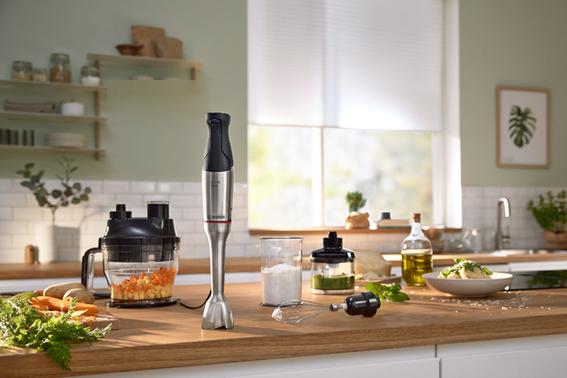 Foto: BoschTyčový mixér ErgoMaster (Bosch), řada nástavců a foodprocesor s nástavci na krájení, cena 6 190 Kč, www.bosch-home.cz
