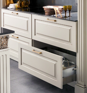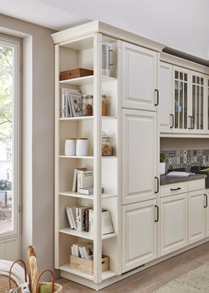 K oživení a optickému rozbití jednolitosti kuchyňského nábytku se u horních skříněk může použít jejich prosklení. Sklo může být čiré, pískované nebo jinak upravené. Když se do prosklených skříněk instaluje světlo, může sloužit jako doplňkové osvětlení, které kuchyni dodá intimnější atmosféru. Prosklená dvířka se hodí hlavně ke klasickému nebo venkovskému stylu.