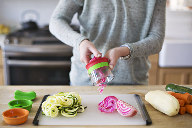 Spiralizér Good Grips (Oxo), tři typy různě dlouhých a širokých zeleninových nebo ovocných proužků, cena 749 Kč, www.pottenpannen.cz