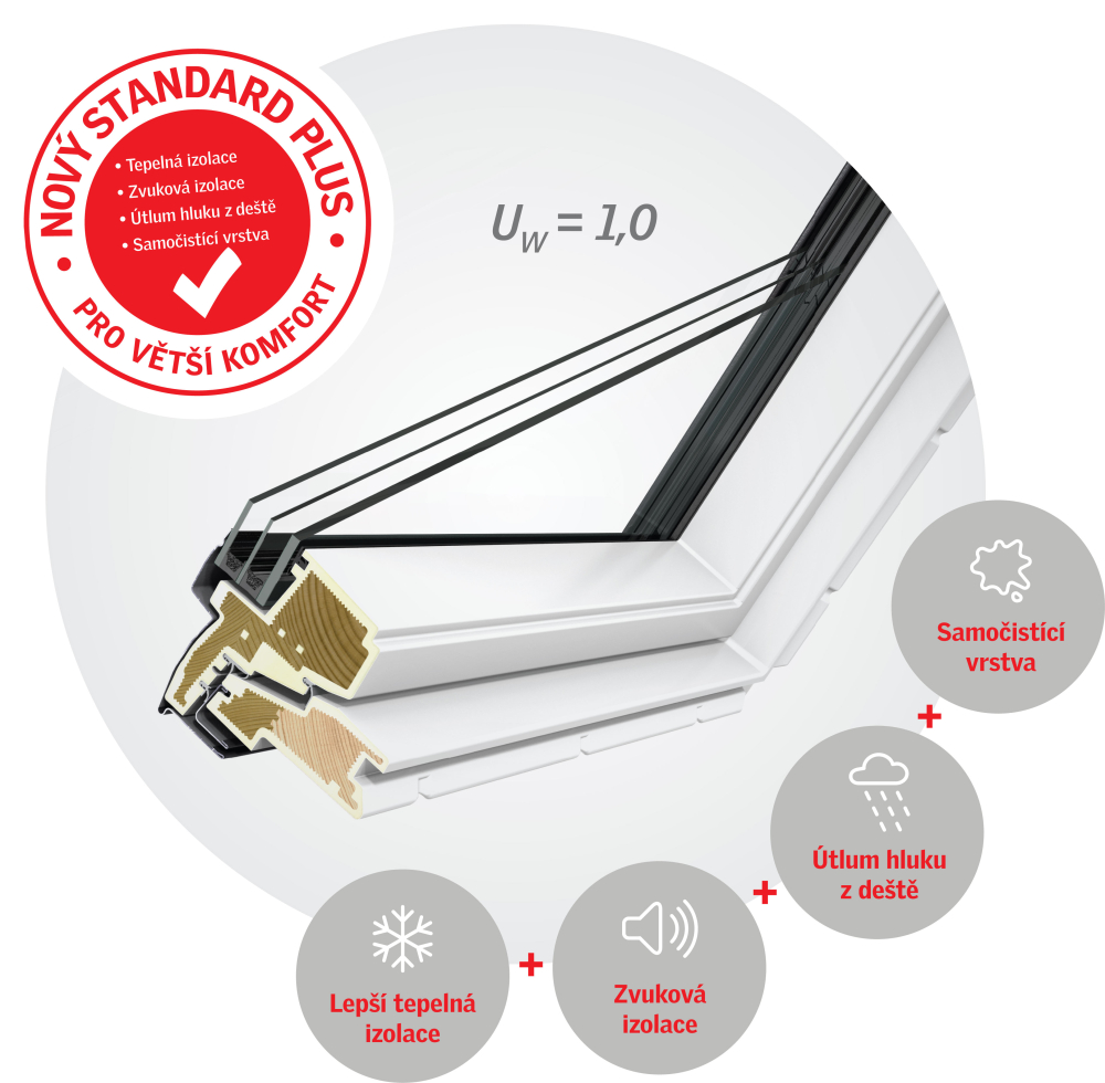 Příkladem jsou nová střešní okna VELUX Standard Plus, která vykazují při dostupné ceně vynikající tepelněizolační parametry. Jsou osazená zasklením 64 s hodnotou součinitele prostupu tepla Uw = 1,0 W/m2K (při zapuštěné montáži dokonce jen Uw = 0,94 W/m2K) a mají solární faktor g = 0,46. Těchto hodnot lze dosáhnout díky dokonalejšímu trojsklu s tloušťkou jednotlivých tabulí 6-3-4 mm, meziskelnímu plynu (Argon) i vylepšenému termoplastickému distančnímu rámečku. Střešní okno VELUX Standard Plus je navíc schopné generovat pasivní solární zisky, tedy „vytápět zdarma“ a zlepšovat energetickou bilanci nejen běžných novostaveb, ale i domů v pasivním standardu.
