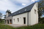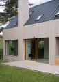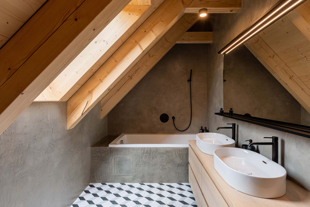 Dále bylo potřeba vyřešit rekonstrukci podkrovních částí původního objektu. Stropní trámová konstrukce byla vyztužena a konstrukce střechy lokálně zesílena. „Nová přístavba je následně navržena jako zděná, založená na základových pasech. Stropní deska je monolitická železobetonová a podkroví je řešeno jako dřevostavba,“ říká architekt a dodává: „Obě části domu pak sjednocuje lehká falcovaná plechová střešní krytina v antracitovém odstínu. Návrh rekonstrukce hledal rovnováhu mezi detailem a finanční náročností zamýšleného provedení. Z tohoto důvodu jsou například žlaby v části domu přiznané, ale zároveň je v určitých místech použita jejich skrytá varianta.“