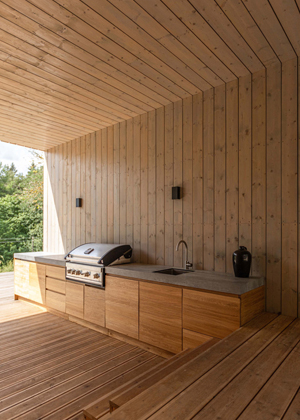 Celému prostoru domu, vně i uvnitř, dominuje dřevo v kombinaci s bílými doplňky, betonem a černými akcenty v podobě vodovodních baterií, světel a dveřního i okenního kování. „Všechny dveře i okna jsme se rozhodli vybavit klikami v černém provedení, a to nám umožnil sortiment českého výrobce M&T, s jehož produkty máme dlouhodobou pozitivní zkušenost z realizovaných projektů. Zvolili jsme kliky Lusy v povrchové úpravě titan černý mat, které působí subtilně a elegantně. Modelová řada navíc zahrnuje také dlouhou kliku pro HS portál, takže nám umožnila pohledově sladit kování v celé realizaci,“ říká architekt Šťastný, který u značky M&T navíc oceňuje, že se jedná o lokální českou výrobu. Roman Ulich, hlavní designér rodinné manufaktury M&T, pak architekta doplňuje s informacemi k samotnému povrchu: „Zvolený povrch titan černý mat vyniká nejen estetickými přednostmi, ale také těmi praktickými. Nejedná se totiž o klasický barevný nástřik – kování je pokryto skutečnou tenkou kovovou vrstvou, která mu dodává vysokou odolnost vůči otěru a poškrábání.“