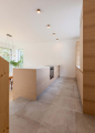 Obě bytové jednotky mají vlastní samostatný vstup. „Do nově přistavené části se vchází ve střední části domu, kde se zároveň nachází zmíněné kryté venkovní posezení. Vnitřní uspořádání domu je logické, obytné místnosti se nacházejí v přízemí a jsou orientované do soukromé části zahrady, zároveň k jihu,“ líčí architekt Šťastný a doplňuje: „Důležitou roli v nové části hraje spojení interiéru a exteriéru a celková prostorová vzdušnost.“ Vertikální propojení mezi přízemím a podkrovím se odehrává právě ve vstupní části. Dominantou je zde betonové, monolitické schodiště s dřevěným obložením. Ze vstupní chodby je přístupné také samostatné WC.