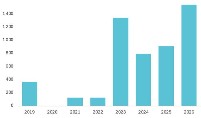 Graf 1 – Počet dokončených bytů v BTR projektech (2019–2026),