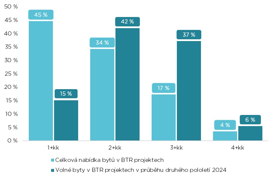 Celková míra neobsazenosti klesla ve druhém pololetí 2024 na pouhých 6 procent oproti 15 procentům v první polovině roku. Projekty uvedené do provozu v roce 2023, stejně jako ty z předchozích let, jsou téměř plně pronajaty, zbývá pouze jedno procento volných bytů. Nové projekty spuštěné během roku 2024 vykazují průměrnou míru neobsazenosti 23 procent, ale podle BTR Consulting lze očekávat jejich brzké pronajmutí, jelikož obsazení nového BTR projektu od jeho otevření trvá obvykle jeden rok. Klíčovým faktorem je v tomto směru velikost bytových jednotek. Menší byty jsou pro nájemníky dostupnější a zároveň poskytují vyšší výnosnost pro investory. Největší poptávka je po bytech s dispozicemi 1+kk, případně 2+kk. Tyto typy bytů proto mají i největší zastoupení v BTR projektech (graf 3), což odpovídá potřebám typických nájemníků – mladých lidí, kteří často žijí sami nebo v páru a preferují cenově dostupné bydlení. Oproti tomu dispozice 3+kk a 4+kk se v BTR projektech obsazují jen obtížně. „Ideální průměrná velikost bytové jednotky v BTR projektu by se měla pohybovat kolem 40 m2. Klientům nabízíme spolupráci na optimalizaci jejich projektů. Díky našim zkušenostem dokážeme poradit jak s vyvážením velikosti a dispozic, tak se standardizací a následným vybavením. Díky těmto optimalizacím jsme na projektech, kde jsme byli zapojeni, dosáhli navýšení celkových očekávaných výnosů o 12–18 procent,“ shrnuje Tomáš Stařík, obchodní ředitel BTR Consulting.