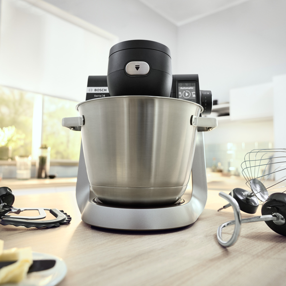Jedinečný design nového robota Series 6 zaujme v každé kuchyni. Boční panely z nerezové oceli podtrhují sofistikovanou estetiku spotřebiče. Také příslušenství – vysoce kvalitní šlehací metla, míchací metla a hnětací hák – bylo upravené tak, aby dokonale doplňovalo nový design Series 6. Je vyrobené výhradně z odolné a robustní nerezové oceli a lze ho mýt v myčce nádobí. Velký, přehledný 2,5palcový displej zobrazuje všechny důležité informace, nastavení časovače nebo volba programu řízeného senzory je snadná a pohodlná. Displej poskytuje informace i o tom, jakou rychlost použít pro které příslušenství, zobrazuje naměřené hodnoty na váze a ukazuje, zda je mixovací nádoba mimo své místo. Integrovaná bezpečnostní opatření zajišťují, že robot nikdy nezačne pracovat náhodně. Při registraci spotřebiče online na myBosch navíc uživatelé získají desetiletou záruku na motor a plášť.