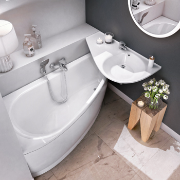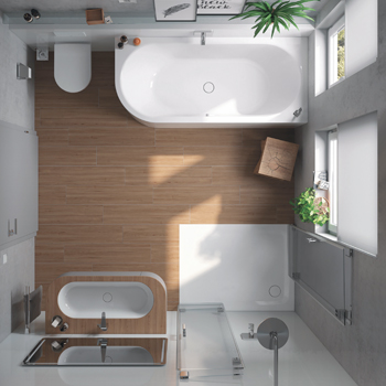 Prostorově úsporné řešení nabízejí asymetrické kusy sanitární keramiky, které jsou atypicky natočené nebo zúžené v méně využívaných částech.