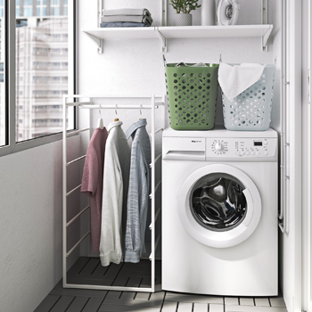 Spíš než horem plněná pračka, která by měla zůstávat pootevřená, je vhodnější úzký typ s předním plněním, který trvale poskytuje plochu na odkládání.