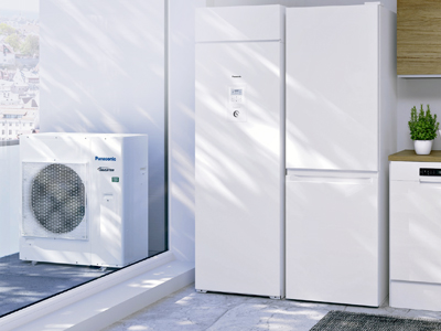 Vnitřní a vnější jednotka tepelného čerpadla Panasonic Aquarea EcoFleX, spojující výhody kanálové jednotky a technologie nanoe™ X, poskytuje TV ohřátou pomocí rekuperace tepla, prostorové vytápění a čistší vzduch, www.aircon.panasonic.eu