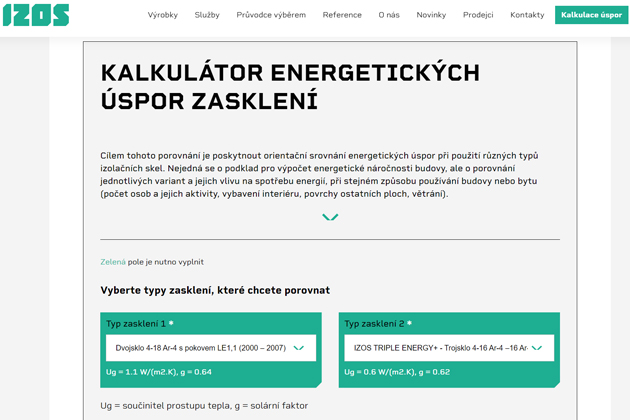 Pokud chytře zvolíte zasklení domu nebo bytu, můžete během roku za energie ušetřit i desetitisíce. Ovšem co to vlastně znamená „chytře“? Jaká skla zvolit pro optimální úsporu? Napoví vám přehledný online nástroj IZOS kalkulátor, který pracuje s celou škálou druhů zasklení, vytápění i aktuálními cenami energií. Online kalkulátor názorně ukáže a vyčíslí jaké jsou rozdíly mezi jednotlivými typy zasklení. Jednoduše s ním zjistíte úsporu v porovnání s původními okny, případně můžete také porovnat užití dvou různých typů zasklení.