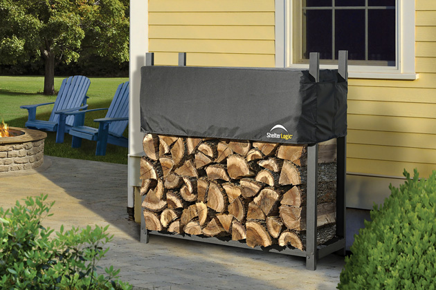Ocelový stojan na dřevo ShelterLogic s plachtou proti dešti, 120 × 36,3 × 118,9 cm, cena 2 475 Kč, www.hornbach.cz