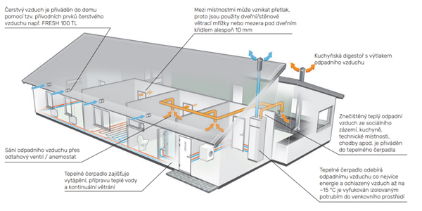 Princip rekuperace energie prostřednictvím vnitřního tepelného čerpadla NIBE S735C, tzv. podtlakový systém větrání s fasádními přívodními prvky: