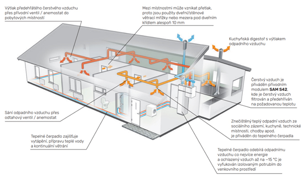 Princip rekuperace energie prostřednictvím vnitřního tepelného čerpadla NIBE S735C s přídavným větracím modulem SAM S42, tzv. rovnotlaký systém řízeného větrání s aktivní rekuperací: