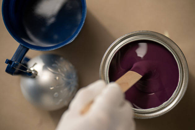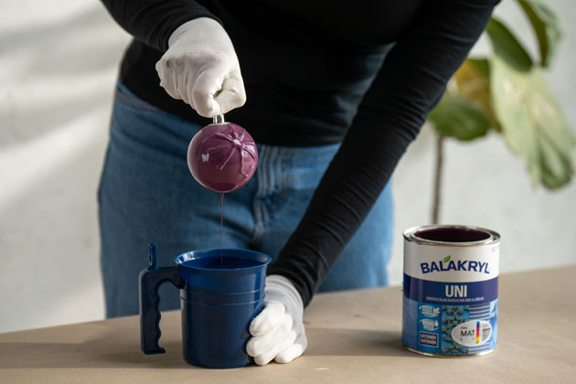 Nátěr před použitím důkladně promíchejte. Vodou ředitelný Balakryl UNI výborně kryje, nezapáchá, rychle schne a má atest na dětské hračky. Do tvoření se tak mohou bez obav zapojit i děti. Pro lepší manipulaci můžete část barvy odlít do plastového kelímku. Každou ozdobu chyťte za očko a celou ji ponořte. Po vytažení nechte přebytečnou barvu okapat. Ozdoby zavěste například pomocí kovových háčků na prádelní sušák nebo na špejle zapíchnuté do víka od krabice. Důležité je, aby se barva na nic neotiskla či nepřilepila a povrch zůstal krásně hladký. Nechte zaschnout alespoň 2 hodiny.