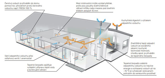 Princip rekuperace energie prostřednictvím vnitřního tepelného čerpadla NIBE S735, tzv. podtlakový systém větrání s fasádními přívodními prvky:
