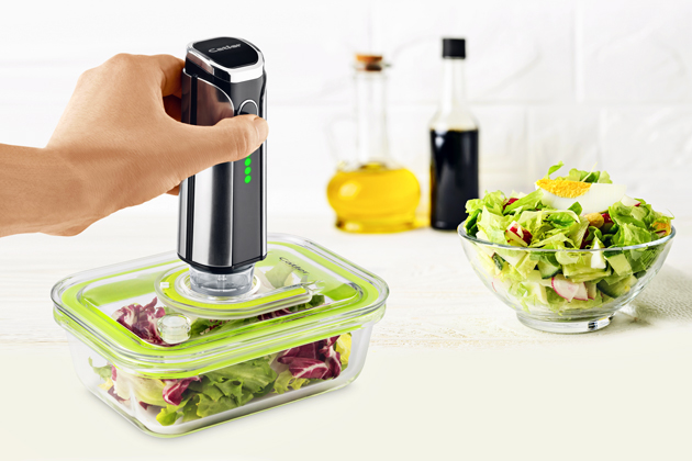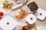 Máte-li doma vakuovačku, s plýtváním potravinami je konec. Vakuování patří k nejefektivnějším způsobům skladování potravin. Odsátím vzduchu z ochranného obalu se v potravinách výrazně zpomalí množení mikroorganismů a 3× až 5× se prodlouží jejich trvanlivost. Nejúčinnější je zavakuování do smrštitelného obalu, který navíc zmenší celkový objem a usnadní skladování. Vakuovačka je jednoduchý přístroj s rychlým použitím a obrovskou efektivitou. Součástí balení bývají kromě přístroje i opakovaně použitelné sáčky a dózy, které lze také dokoupit.