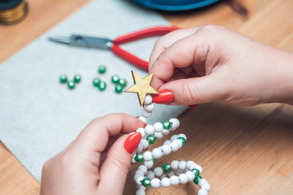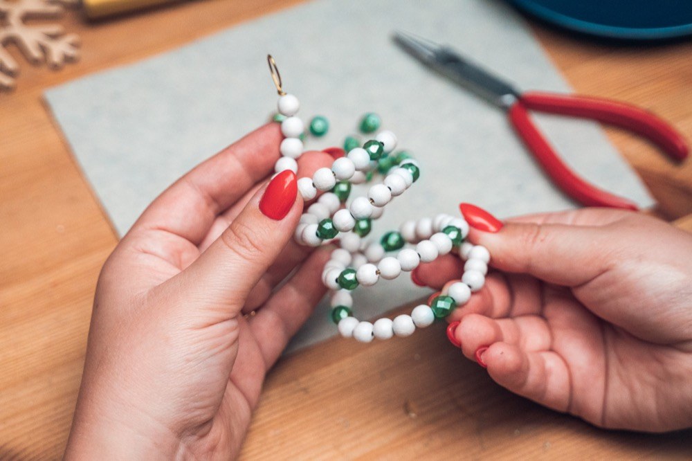 - Na drátek navlékneme korálky – po 5 ks bílých korálků navlékneme 1 zelený a pomocí kleští na obou koncích drátek ohneme do smyčky.