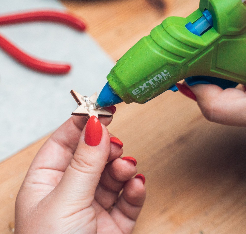 - Na vrchní smyčku drátku přilepíme pomocí tavné pistole dřevěnou hvězdičku. Můžete ji nechat přírodní, nebo jí jako my akrylovou fixou namalovat na zlato.