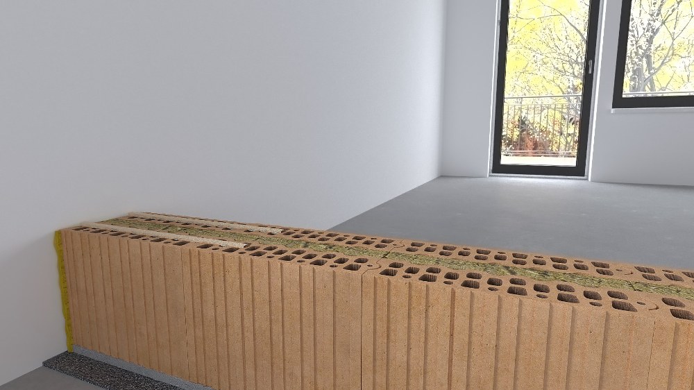Mezi pruhy je mezera 3-4 cm, která odpovídá tloušťce minerální vlny v cihelných blocích HELUZ AKU KOMPAKT 21 broušená.