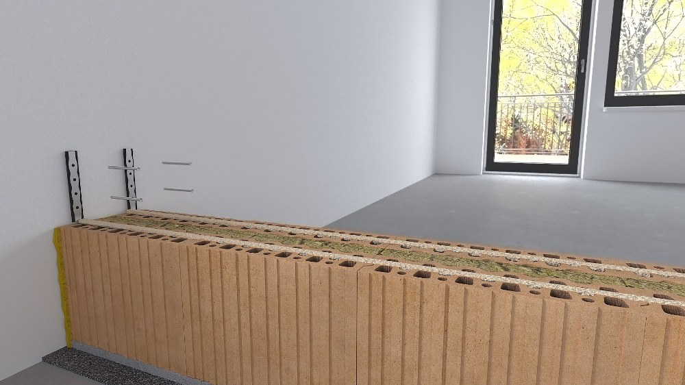 Do každé druhé ložné spáry se použijí dvě nerezové kotvy podlepené pěnovou páskou pro připevnění ke stávajícím stěnám. Při vkládání kotev do ložné spáry je třeba cihelné tvarovky mírně zbrousit – vytvořit drážku pro kotvu, aby nedošlo k rozevření ložné spáry. Kotva se ke stávající stěně připevní pomocí hmoždinky popř. samořezným šroubem.