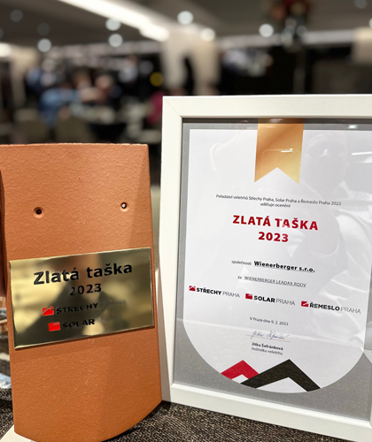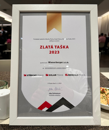 Unikátní hydroizolační folie Leadax Roov od společnosti Wienerberger získala na veletrhu Střechy Praha 2023 ocenění Zlatá taška. Odborná porota ocenila její praktičnost i ekologické přednosti. Cílem soutěže je zviditelnit produkty, které přináší významný pokrok, dosahují ve svém oboru světové úrovně, nabízí mimořádnou kvalitu za přijatelnou cenu nebo jsou zvláště šetrné vůči životnímu prostředí. Do 21. ročníku soutěže o nejlepší exponáty veletrhu bylo přihlášeno celkem 15 inovací, ze kterých dva získaly titul a čtyři čestná uznání.
