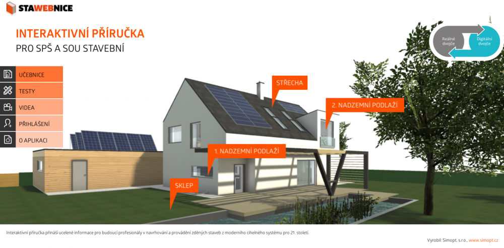 Interaktivní příručka STAWEBNICE je určena především studentům a učitelům středních průmyslových škol a středních odborných učilišť stavebních, ale je dostupná i pro všechny zájemce o stavební obor. V aplikaci naleznete zpracované kapitoly s tématikou stavebnictví, základní testy k jednotlivým kapitolám, edukační videa a v neposlední řadě 3D model nulového domu.