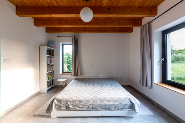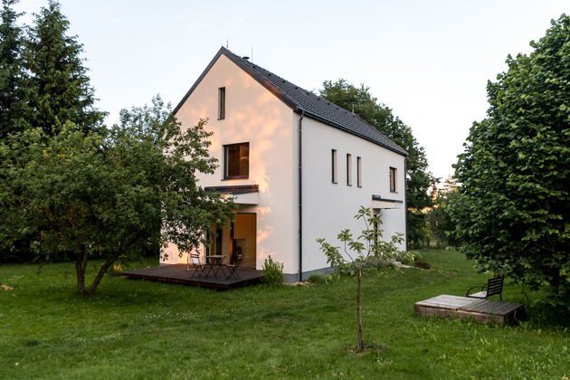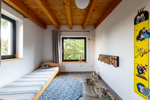 Dnes už čtyřčlenné rodině ušetřilo náklady na dům pár podstatných věcí – vlastní pozemek a autorský projekt, zároveň svépomocná výstavba. „Hodně nám pomohla rodina, kamarádi. Na složitější činnosti jsme přizvali místní řemeslníky – pokaždé z blízkého okolí, žádná doprava přes polovinu republiky. Až na pár výjimek jsem byl na stavbě v montérkách pokaždé, pokud se něco dělo. Postupně jsem si troufnul i na náročnější práce, což je pro architekta nedocenitelná zkušenost. Stavba trvala krátce přes dva roky a zvládli jsme ji bez náročnějších technologií. Na druhou stranu v domě máme opravdu jen to, co potřebujeme,“ připomíná Zdeněk.