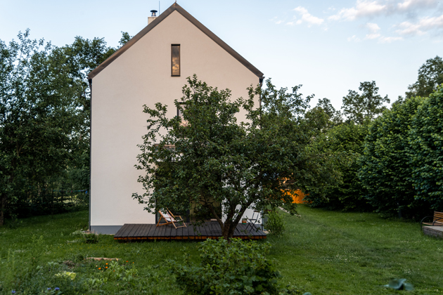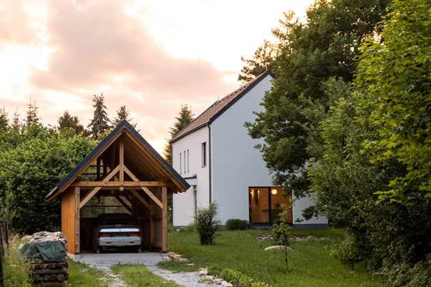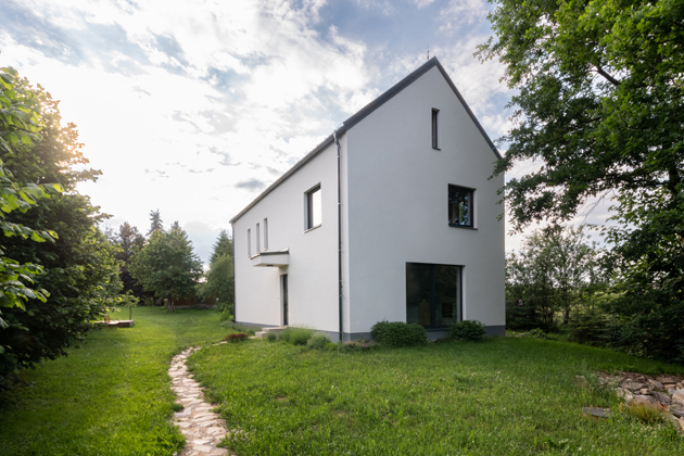 Polosamota se vzrostlými stromy, na které bychom na nové parcele čekali celý život, tak popisují manželé jejich pozemek. Se zahradou mají velké plány, ale charakter jí do budoucna ponechají přírodní. Rádi by docílili toho, aby je zahrada takřka celoročně zásobovala vlastnoručně vypěstovanými potravinami. Za největší úspěch Zdeněk Pech považuje, že se mu povedlo usadit rodinný dům (který zaujal i v hlasování v soutěži HELUZ Dům roku 2021) na poměrně složitý pozemek tvarem připomínající trychtýř. Stavba působí, že je s ním srostlá, zároveň plně využívá jeho výhod a doplňuje jej. „Z patra máme nádherné výhledy na kamenolom, kopec Brčík, táhlou louku či kostel. V létě je doma příjemně chladno díky stínu vzrostlých stromů. Když na zimu opadají, do oken hřeje zimní slunce. Regulativy nastavené územním plánem byly adekvátní a na výslednou podobu domu neměly vliv. Novostavba využívá prvky současné architektury, nicméně jsem hlídal, aby zapadla do měřítka okolní zástavby. Největším oceněním je, jde-li někdo okolo a dům okomentuje slovy – jako by tu stál odjakživa,“ zmiňuje spokojený majitel a autor návrhu vycházejícího z lidové architektury.