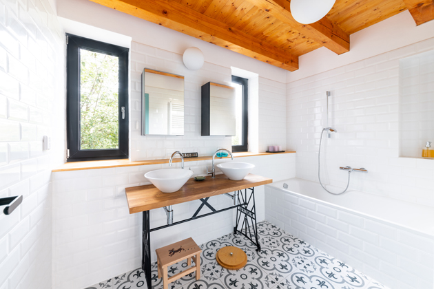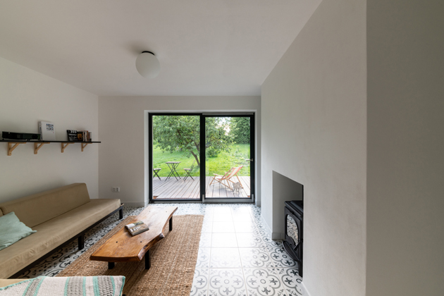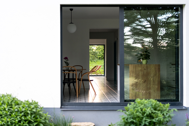 Dům je navržený jako tradiční venkovský troj-trakt. Dovnitř se vstupuje střední částí, v níž jsou umístěné schodiště a provozní místnosti. Do dvou bočních architekt navrhl ty obytné. „Lidový‘ troj-trakt má zkrátka všestranné výhody. Už samotné nosné zdivo totiž jednotlivé trakty/zóny akusticky odizoluje. V rámci každého traktu jsem si proto mohl dovolit jen obyčejné příčky o tloušťce 11,5 centimetrů. Místnosti s podobným provozem, tudíž nebylo nutné mezi sebou navíc odhlučňovat,“ vysvětluje architekt a pokračuje: „Nízký rozpočet na interiér jsem bral jako výzvu. Upřednostnili jsme atypické výrobky z kvalitních materiálů před masovou produkcí. Někdy jsme recyklovali – židle TON jsme koupili z vyřazeného interiéru kavárny,“ říká Zdeněk, který rozkresloval zařízení včetně kuchyňské linky vyrobené v truhlářství Holoubek nábytek. Řešení konzultoval s manželkou od fáze studie a s úsměvem vysvětluje: „Bral jsem ji jako klienta. Rozdělení rolí fungovalo, architekt totiž potřebuje mantinely.“ Kristýna si přála oddělenou obytnou kuchyň. Varianta, která sice nezapadá do současného trendu otevřených obývacích pokojů, ale rodina tím získala dvě místa pro společný život. Oblíbenou je rovněž terasa poskládaná ze smrkových prken (při stavbě používaných jako bednění či lešení). Povrch stačilo obrousit a několikrát natřít směsí dřevního téru a fermeže. Překvapivě třetím rokem prkna odolávají dešti, slunci, sněhu a vypadají, jako v momentě, když je smontovali. „Doma jsme nechtěli zůstat jen u bílé a šedé, proto jsme sáhli po šik mentolové na dveřích. Výrazným prvkem je určitě i dlažba s květinovým dekorem probíhající v ploše bez přerušení. Připomíná nám louku, kterou jsme domem zabrali,“ uzavírají spokojeně majitelé.