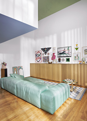 Za hlavní a zároveň i dominantní místnost můžeme považovat velký otevřený prostor, v němž se nachází obytná část. Obývací pokoj si designérka představovala jako místo k odpočinku a čerpání inspirace. Pohovka Pixel od Saba, čalouněná látkou Loop od l’Opificio, je zde jako pomyslný obláček vybízející hosty k uvolnění těla i mysli.