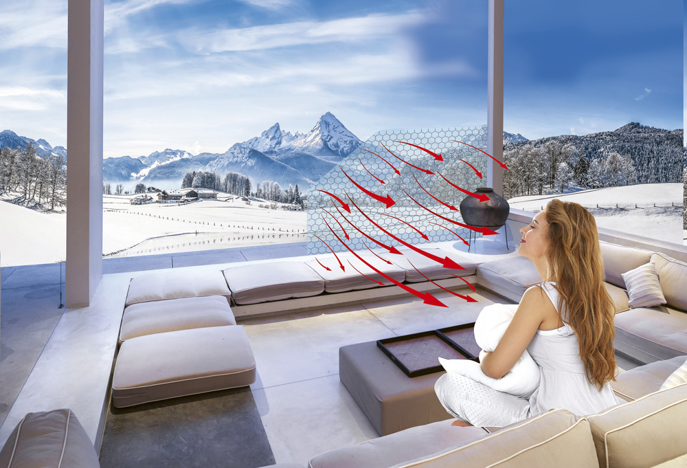 - Z teplého vydýchaného vzduchu v místnosti se odebere teplo, které ohřeje chladný čerstvý vzduch. Tak se získá až 71 % energie zpět, díky filtru se dovnitř nedostane žádný alergen.