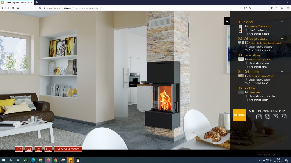 Tím jsme vyřešili, jak komín, tak krbovou vložku, jelikož se jedná o kompaktní balíček obou produktů. Vzduch potřebný k hoření je přiváděn meziprostorem v komínové vložce, nebylo proto nutné řešit žádné složité přívody vzduchu ke krbu. Vzhledem k menší rozloze našeho domu oceňujeme i prostorově úsporný koncept krbu a na něj přímo napojený komín. Oba jsme nadšení i z vizuální stránky systému Sirius, který přesně vystihl naší představu. Umístění jsme si mohli předem poměrně věrně promyslet pomocí online stránky, na které můžete měnit umístění i jednotlivé typy krbových vložek.
