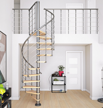Foto: HornbachTočité schodiště Koralia (Pertura), Ø 140 cm, schodnice z lepeného buku o nosnosti 150 kg, kovové zábradlí, cena 47 300 Kč, www.hornbach.cz